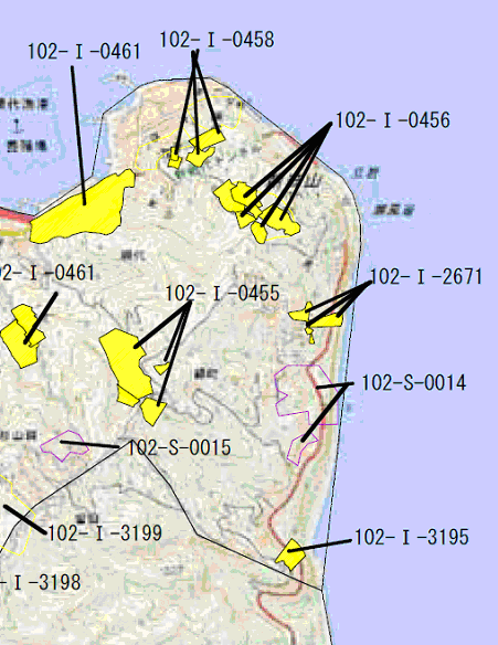 27年8月31日付けで、静岡県熱海土木事務所は土砂災害危険箇所の新規抽出結果を公表しました。網代山町内で急傾斜崩壊危険箇所が新規に2箇所指定されました。これまで会員の皆様に配布している防災マップには、土砂災害危険箇所は平成15年公表の土石流危険渓流と急斜面崩壊危険箇所を載せてありますが、これに急斜面崩壊危険箇所が2箇所が加わることになります。 2箇所とも国道135号線近くの山側です。 具体的には、以下の公表地図でご確認ください。急傾斜地崩壊危険箇所を既指定箇所と併せ、転載します。 1箇所は緑町バス停付近から宇佐美側にかけて、国道を挟み、海から網代山に向けての急斜面一帯(箇所番号102-S-0014: 紫の枠線で囲われた領域:一部は2004年の崩落箇所に重なります)、もう1箇所はマンション南熱海、あじろ食堂・磯船ホテルの裏山一帯です(箇所番号は上記と同一 102-S-0014紫の枠線で囲われた領域)。